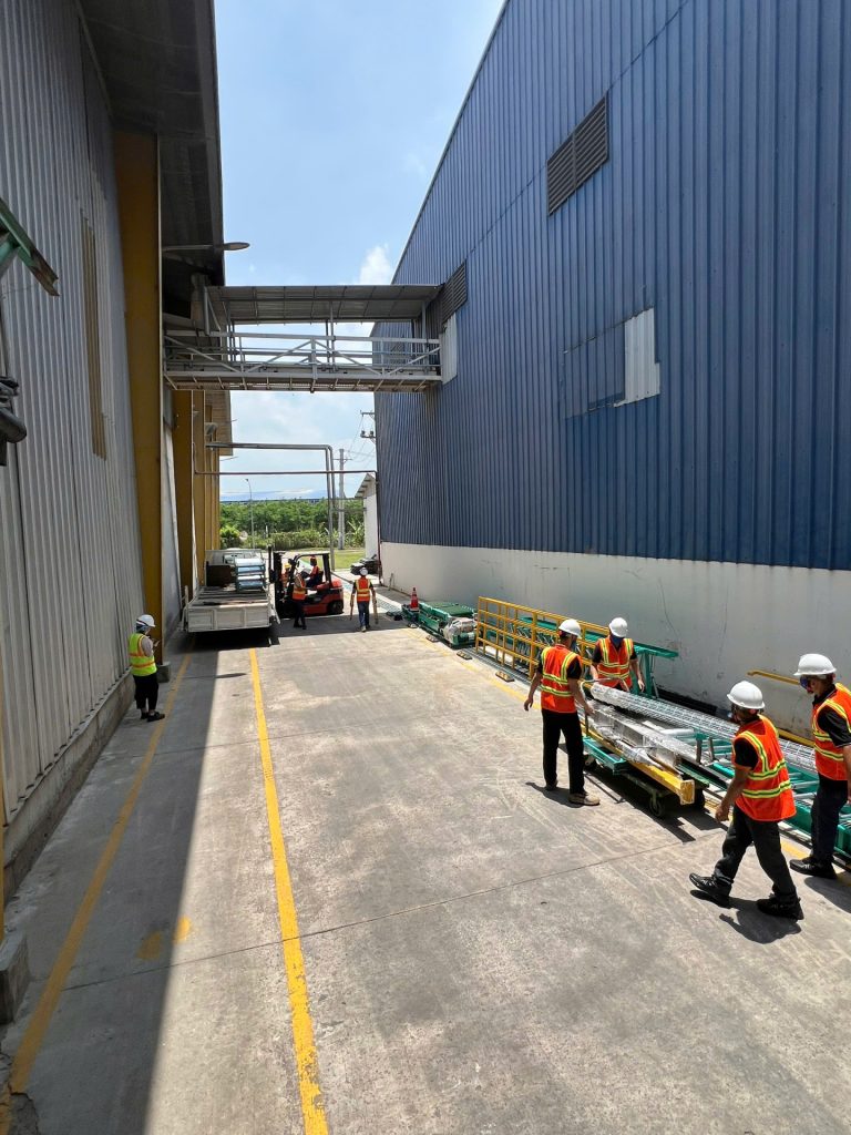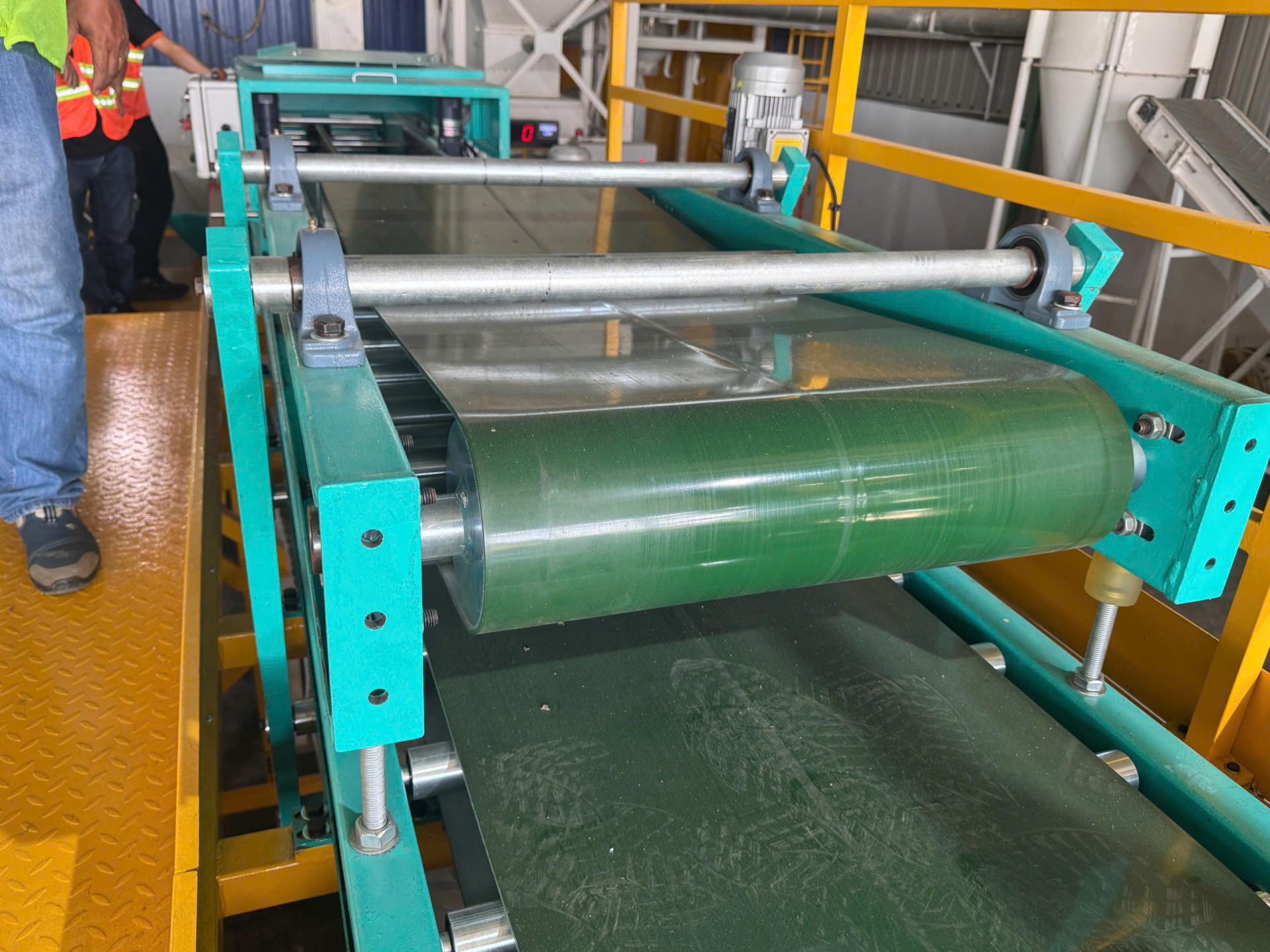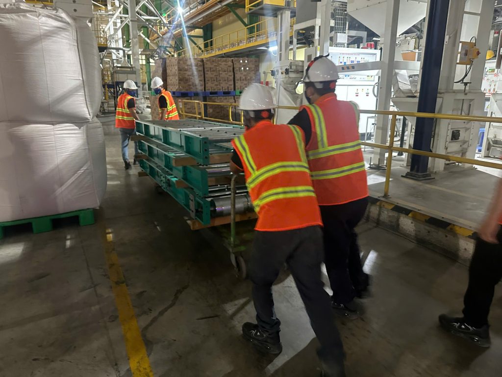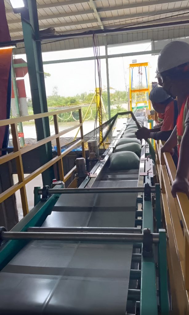 Vận chuyển trong dây chuyền gạo từ sông vào bên trong nhà máy. Băng tải dài, chắc chắn, được thiết kế để di chuyển bao gạo đến các khu vực xử lý tiếp theo, đảm bảo quy trình sản xuất liên tục và hiệu quả.